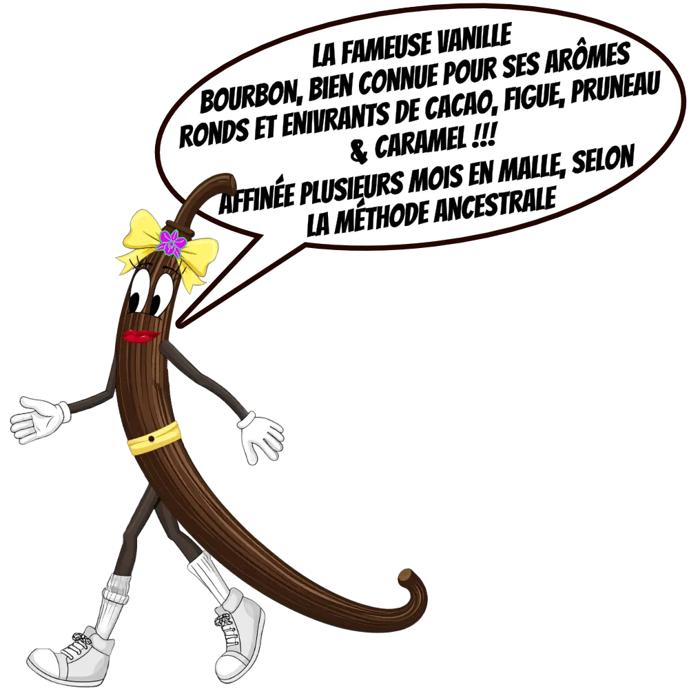 « La fameuse vanille bourbon, bien connue pour ses notes florales caractéristiques & ses arômes ronds et enivrants de cacao, figue, pruneau & caramel !!! Affinée plusieurs mois en malle, selon la méthode ancestrale. Un savoir faire et un terroir qui lui confère son image de la meilleure gousse de vanille depuis des années »