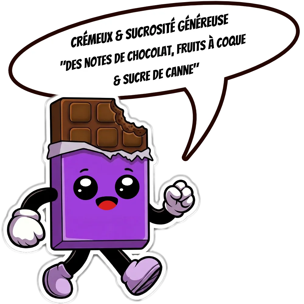 « Un café crémeux doté d’une généreuse sucrosité sur des notes de chocolat, de fruits à coques & de canne à sucre »
